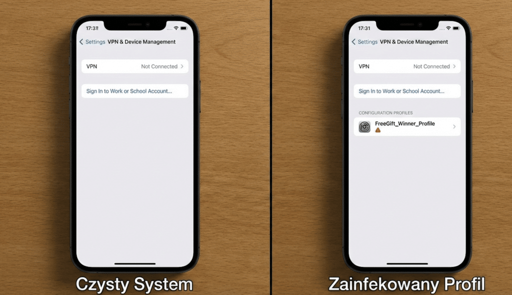 - Rozwiązanie: Sprawdź Ustawienia > Ogólne > VPN i zarządzanie urządzeniami. Jeśli widzisz tam coś podejrzanego – usuń to natychmiast.
